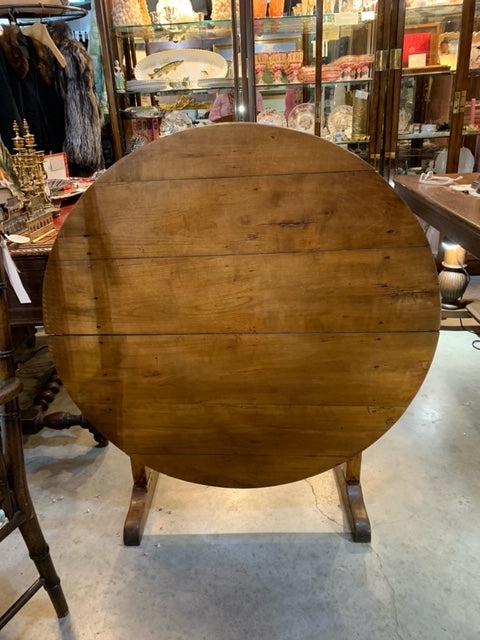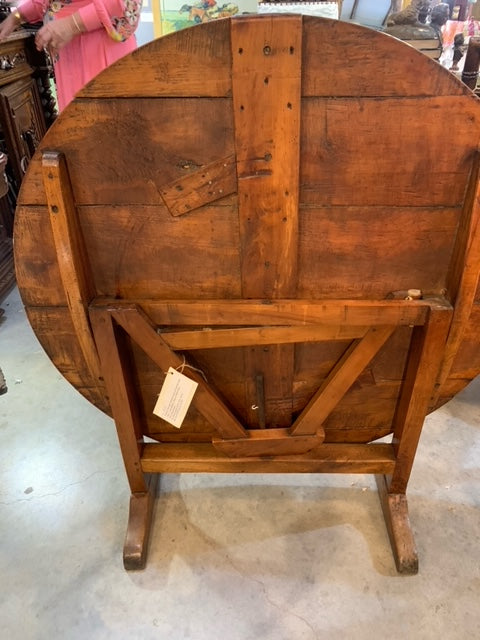 About: French Provincial fruitwood tilt-top wine tasting table, 19th C., Oval Tabletop, rising on trestle base, with swing support. A decorators must!! This Antique wine table is perfect as a cocktail table between two chairs. So Functional and moveable around the house.